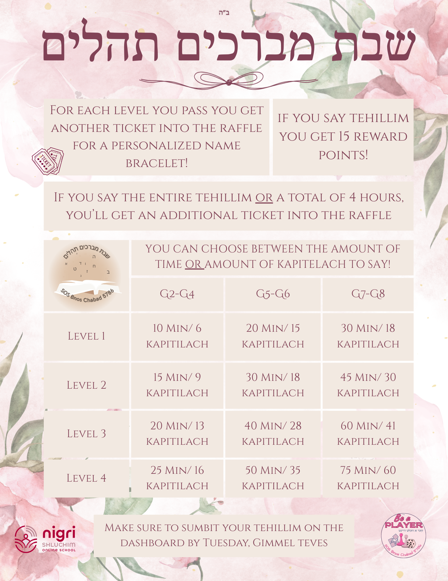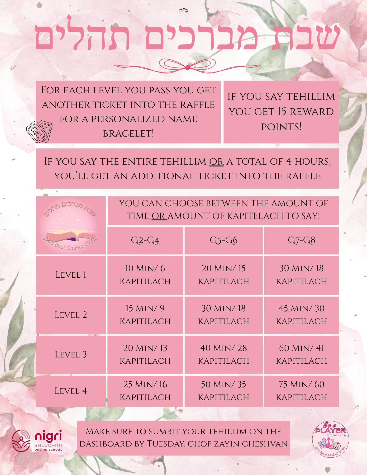 Hey everyone! Good job for saying Tehillim on Shabbos Mevorchim! Let us know if you completed your quota and you will be entered into a raffle for a beautiful name bracelet!